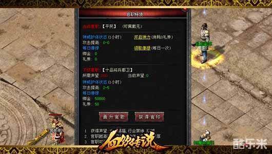 玩家在等级达到42级之后,主线任务即开启官职系统。在主城沙盟与NPC“官职特使”对话,即可查看当前官职等级与每日可领取俸禄等信息。