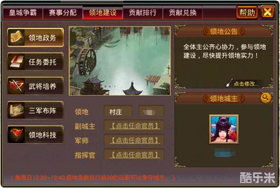 当有玩家抢夺到城主之后,可对领地进行修改公告、任命官员、培养武将等一系列提升领地实力的建设。