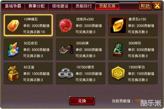 贡献兑换为神器组合功能所需要的“神缘石”资源最主要的来源。