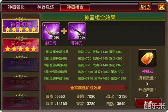 升级组合需要消耗神缘石。升级后可获得全军属性的加成。