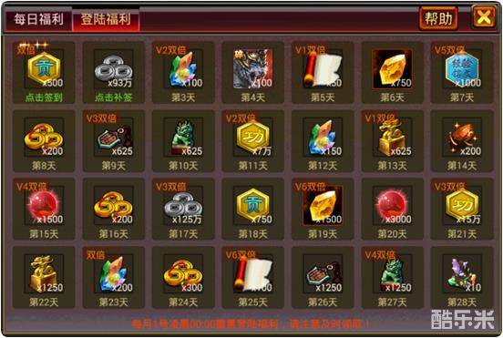 每天登陆游戏都可以领取1次福利奖励,部分登陆天数中,VIP的玩家会获得双倍登陆福利奖励。