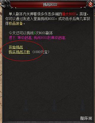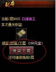 每天玩家有一次挑战BOSS的机会,机会用完可以花费元宝购买次数,另外每一层不光BOSS会掉落大量奖励,玩家还会通过悬浮窗口处领取坐骑残卷的奖励进入下一层,在领取悬浮窗口坐骑残卷时,玩家可以花费少量元宝领取双倍坐骑残卷。
