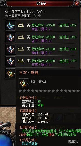复生戒指:角色死亡后立即满状态复生,佩戴复生戒指后,角色一旦死亡立即原地满状态复生,死亡复生时不掉落任何装备。