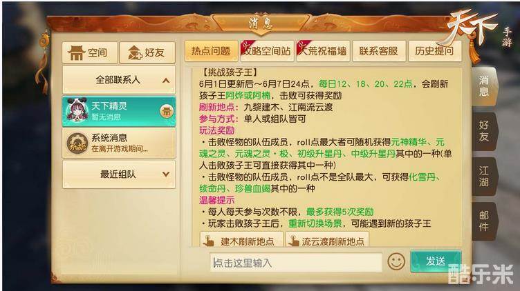 6月1日更新后至6月7日每日12、18、20、22点,在九黎建木与江南流云渡等地,将会出现孩子王特殊怪物,率先找到并击败他们的少侠将会获得丰厚奖励呦!