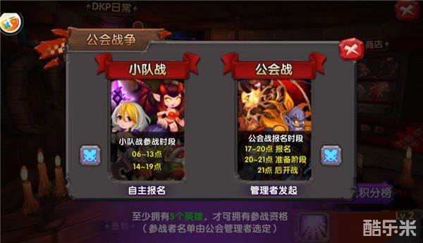 公会战争有两种模式:一是小队战,二是公会战。参战的基本条件是:必须拥有至少5个英雄,才有资格参战。