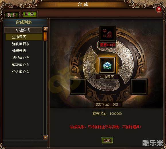 其他道具怎么合成呢?生命果实需要100个生命宝石精华,强化HP药水需要10个生命宝石精华,仙兽精魄需要1个驯兽口粮,地煞虎心石需要3个天罡虎心石,蟠龙虎心石需要3个地煞虎心石,圣天虎心石需要3个蟠龙虎心。
