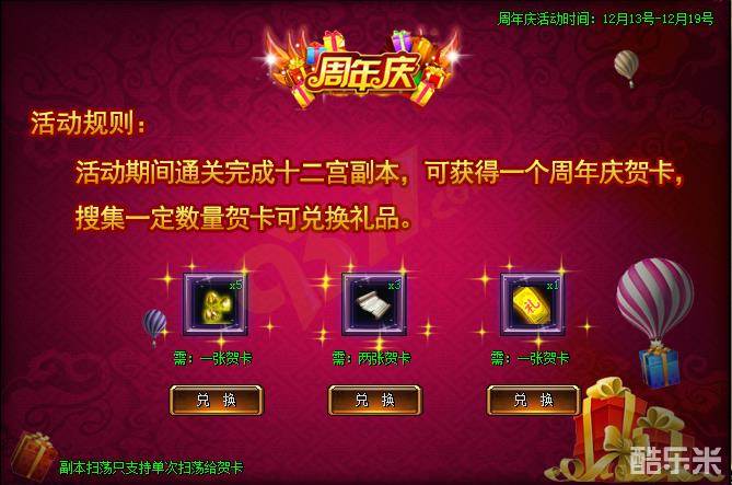 十二宫副本每天有3次进入的机会,免费参加1次、VIP特权进入1次、使用金矿进入1次。也就是说,玩家一天有可能获得3张周年庆贺卡。那么赤月传说周年庆贺卡怎么用呢?