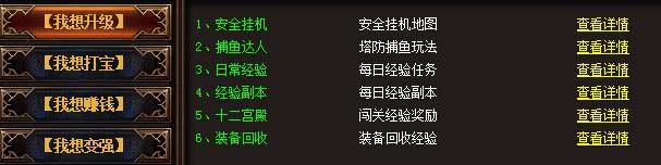 首先,在赤月传说游戏主界面上方,玩家点击“游戏宝典”可查看升级、打宝、赚钱、变强和充值的相关操作。而在“我想打宝”标签里,玩家可查看青龙套装、白虎套装、朱雀套装、玄武套装、火龙套装和战甲等装备的获取途径。