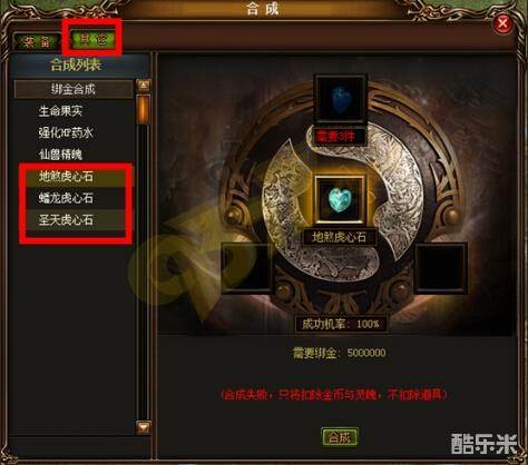 虎心石可以通过合成来提升等级。在合成界面,玩家可以消耗绑定金币和赤月传说灵魄对虎心石进行合成的操作,如拥有天罡虎心石后,使用3个加绑金可合成地煞;