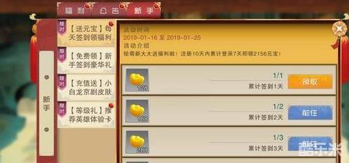 在【活动】-【新手】里面,有一个送元宝的福利,新手在注册账号的10天内累计登录7天可以领到2156元宝,可以说非常值得的一个方式,新手前往不要错过。