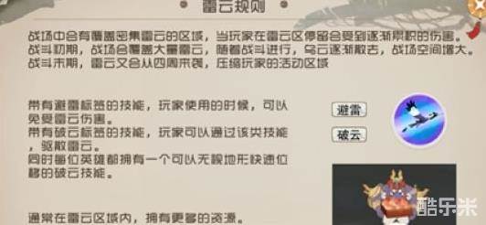 在战场中我们争夺仙桃或者据点时可能会有雷云的出现,如若我们人物误入雷云区域将会持续掉血,不过我们可以使用雷云、避雷技能来解决此类情况。