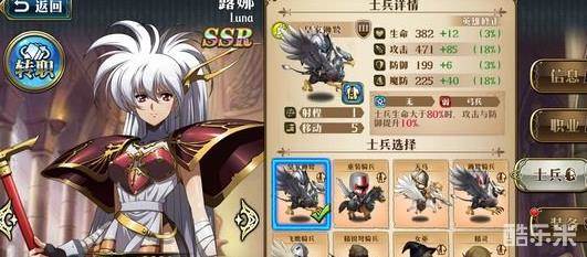 露娜大多数为弓骑露娜,当然也是有玩家玩飞露娜的,无论是弓骑露娜还是飞露娜,都是可以考虑兵种携带突袭弩骑兵、旋风游骑兵。突袭弩骑兵的被动是主动进入战斗前使对方移动速度降低2点,降低防御,虽然突袭弩骑兵面板攻击不高,但是触发了被动的话,减防的收益是在战斗前就生效,自身是可以享受到的,总体输出还行,而降低移动的被动就十分有战略价值,可以打起风筝战术,需要携带武器乌勒尔之弓。而旋风游骑兵这个兵种比较适合近战露娜,偏向防御方面,需要携带极限魔弓来触发旋风游骑兵的特性,打出超绝的效果。