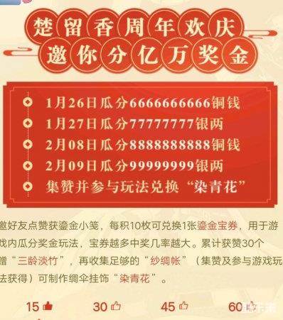 每集齐15个赞会收到邮件:5个鎏金小笺、1个纱绸帐。