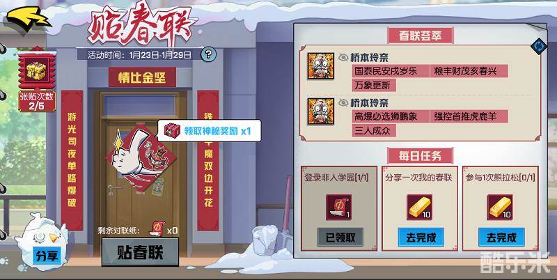 而每次贴春联还将召唤出不同的门神,门神将代表《非人学园》给大家送上惊喜奖励,有机会获得合同文本、迷之染色剂、定制星星、史诗星星、传说星星等稀有道具,累次张贴5次春联还可获得【上分大吉】头像框!