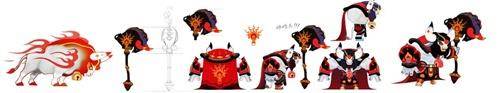 牛魔王的设计可谓良心,原画甚至如同变形金刚般,可以从牛形态到人形态自由切换。红黑的主色调沉稳霸气,法杖的牛头部分可谓点睛之笔。