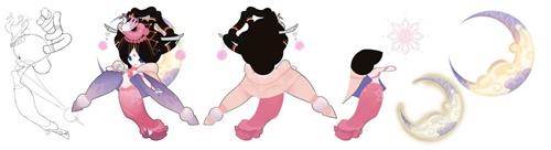 嫦娥的设计主要分真身和月亮两个部分,契合了奔月的主题。除此以外,嫦娥的形象融入了唐装的概念,齐胸襦裙、唐圆领袍、交领襦裙,甚至将花钿这样的小细节也体现了出来。