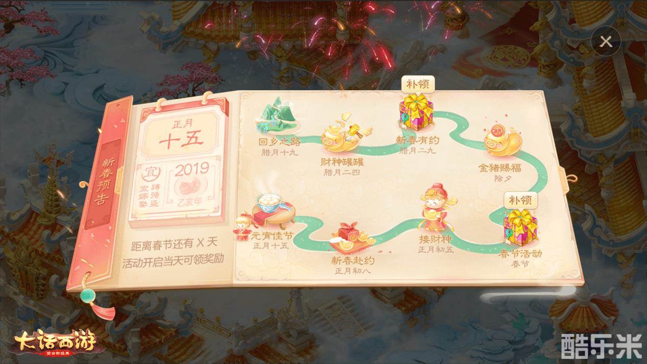 为了帮助大家一目了然地了解春节的活动日程,1月24日-2月20日期间,大家通过“新春预告”页面就能够看到春节系列主要活动的节点日期,点击节点还能方便查看当天的特色活动介绍!不仅如此,大话更在每个好日子都为大家准备了一份礼物,其中包含着经验、见闻录、高级残卷、宝石……节点当天上线即可领取,就算错过也可以花费小额银两补领奖励哦!