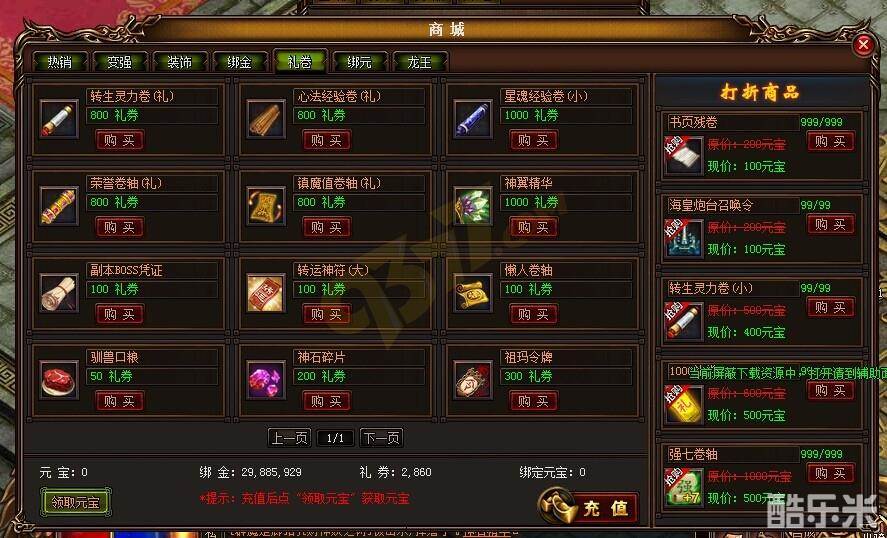 赤月传说礼券是游戏里的三大货币,它的价值于元宝和绑定元宝。大家可以利用礼券,购买商城的礼券栏里的物品。目前,赤月传说商城礼券栏的商品,主要12种,分别有转生灵力卷、心法经验卷、星魂经验卷、荣誉卷轴、镇魔值卷轴、神翼精华、副本BOSS凭证、转运神符(大)、懒人卷轴、驯兽口粮、神石碎片、祖玛令牌。每种道具的价格都不一样,大家可以到礼券栏了解一下。