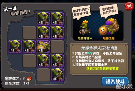 这个副本中只有生成才是王道,此玩法只能上阵英雄,宝宝不能上阵,而且开场英雄满怒气,干翻全场有么有,一定要挑选群攻技能英雄,在一会和内秒掉所有地精,炸弹人的自杀攻击可以很恐怖的。