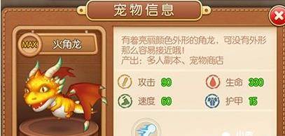 点评:如果你有幸在30级阶段获得火角龙,那么这只宠物绝对值得培养到满级,并且在60级之前,很难有其他宠物能真正替代火角龙的地位。受到攻击有概率获得加速状态,虽然只持续一回合,但足够完成残血反杀的重任,尤其是14%的触发概率,甚至要高过同技能的45级紫影龙。