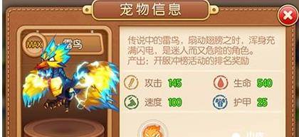 点评:雷鸟的入手门槛比较高,但作为一只中期橙宠,高达100点的速度属性加成在60级之前几乎无法撼动,而且其他各项属性发育也较为均衡,“复仇”技能一旦触发更是可以给敌人致命一击,非常适合输出型玩家携带。