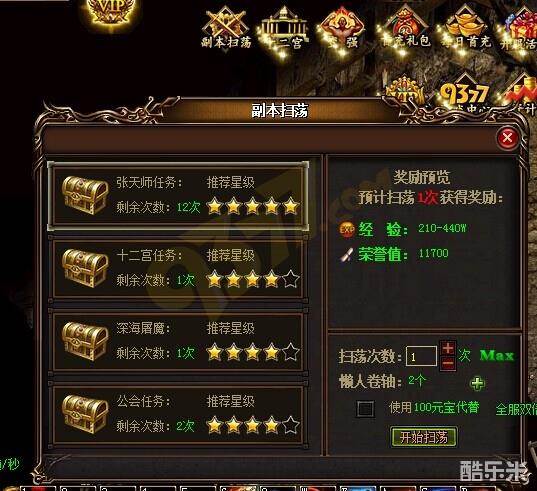 十二宫任务扫荡默认为1次,VIP玩家和持有金矿的玩家不能增加扫荡次数,可直接进入该副本通关完成。每次副本扫荡消耗10个懒人卷轴;