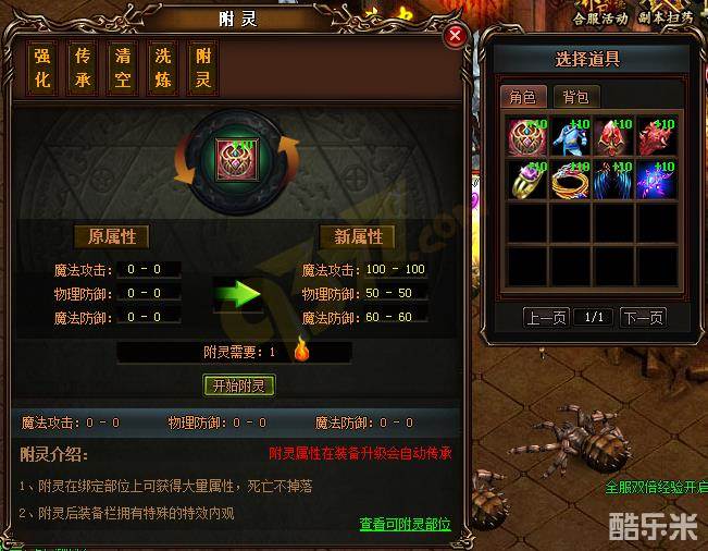 附灵系统位于强化界面的很后一栏,切换到附灵界面后,在右侧点击可选择的装备将其放入装备栏中,就可以在左侧预览到原属性与新属性的区别。装备附灵后可提升攻击100、物理防御50、魔法防御60,9件装备都附灵的话,加起来的属性可是相当高的哦!