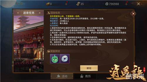 《逍遥诀》的少侠们只需达到玩法指定等级,在活动时间内参与“送亲玩法”即可将新娘子叶远安一路护送至新郎穆乐处进行拜堂成亲。但是,别以为送亲只是简单地跑跑任务,加入了送亲队伍的少侠们步速将会变慢,也不能使用御剑进行飞行偷跑哦!从远安父亲叶甫成领取任务后,少侠需先按照规定路线陪送新娘寻到对应的NPC和走完相关的任务点,完成任务即可获得丰厚的奖励!