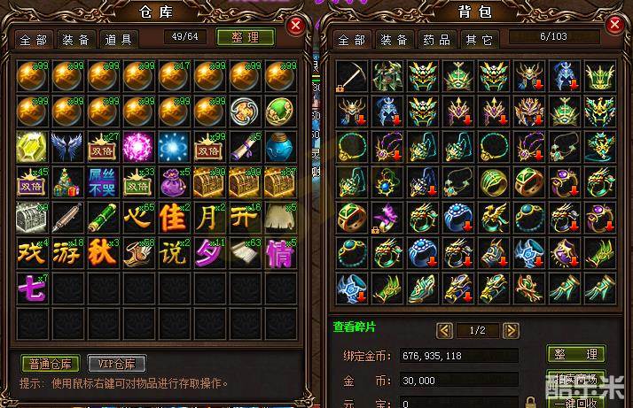 在VIP仓库,你可以存放装备或者道具,在该界面上方,你可以通过全部、装备、道具这三个分类来查看存放在这里的各个物品,点击“整理”按钮即可对这里的所有物品进行叠加或调整位置。只需使用鼠标右键即可对物品进行存取操作,双击也可取出。