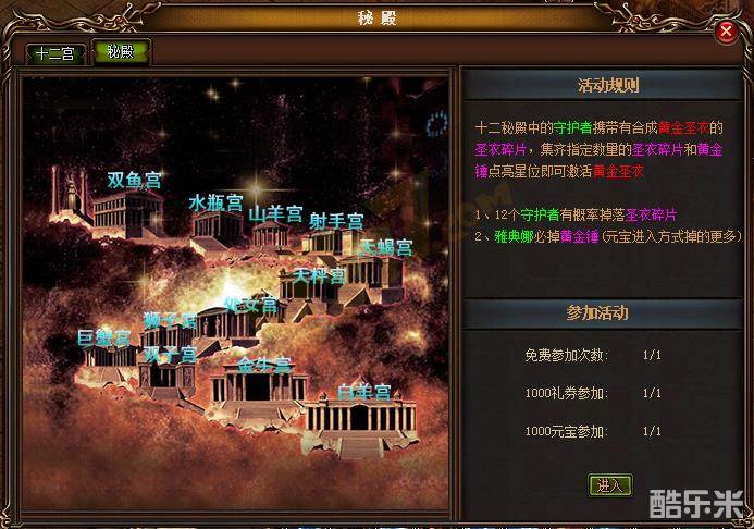 赤月传说十二秘殿的入口与十二宫的入口在同一个地方,点击导航栏上的“十二宫”图标即可切换到秘殿界面。秘殿每天可进入3次,免费,1000礼券,1000元宝。
