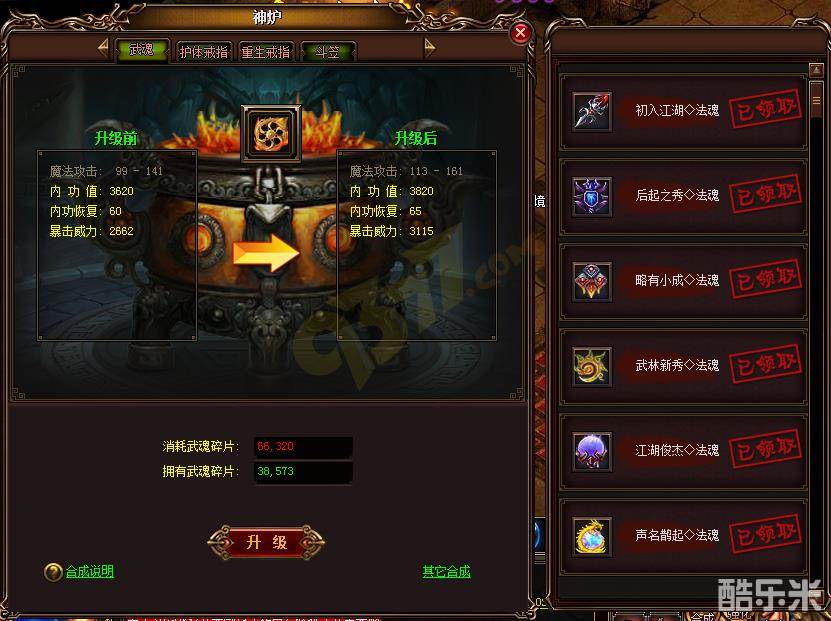 赤月传说武魂的锻造与特戒、盾牌、勋章、神石等特殊装备类似,都可在荒漠土城的锻造神炉或合成系统中的神炉处锻造升级。锻造升级时需要消耗大量的武魂碎片,越需要的就越多。
