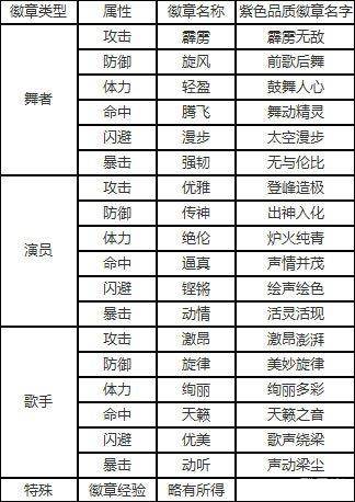3.不同种类、不同品质的演艺徽章的加成数值不同。