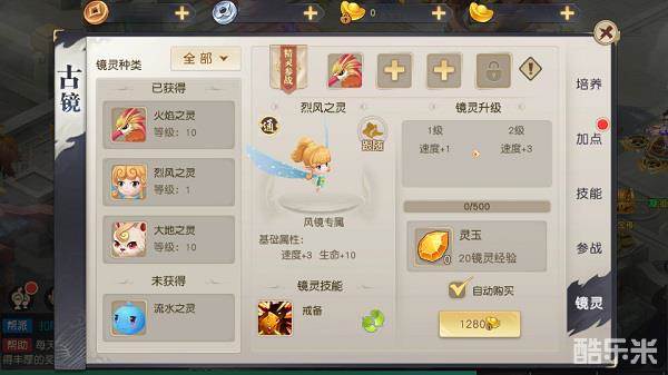 镜灵属性:镜灵的属性分为基础属性和升级属性,基础属性获得精灵的时候就可直接生效,升级属性可通过消耗道具进行培养提高,需要精灵参战,升级属性才会生效。需要注意的是,古镜精灵的被动技能需要参战才可以生效。