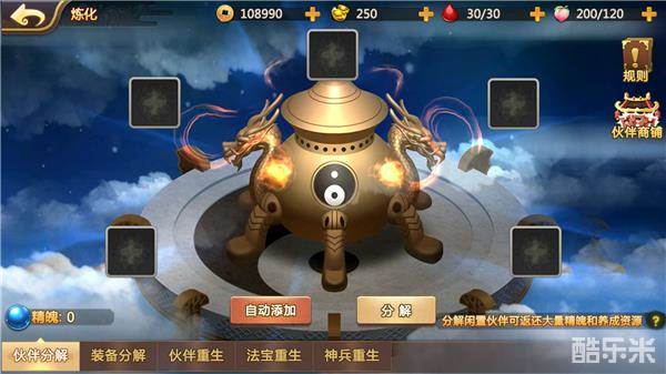 炼化功能分为分解和重生两大类。其中分解是将伙伴、装备直接分解为对应商城的货币。在分解的同时返还伙伴、装备养成消耗的全部资源