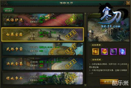 《寒刀》是一款满载武侠情怀的ARPG网页游戏精品,以为无上观复仇、为江湖武林铲除鬼煞宗这一邪恶势力为游戏剧情主线,通过细腻精美的特效表现、飘逸流畅的轻功动作、唯美清新的地图风景、引人入深的游戏剧情,生动谱写江湖中的恩怨情仇,侠义直肠,每日活动精彩纷呈,又根据剧情变化推出珍兽、名器等新奇系统,为你倾力打造一个真实的江湖武林,展现一个恢弘的武侠世界。江湖上的事情都是口口相传,孰对孰错是讲不清楚的,当局者迷,有些小道消息是不值得相信的。当武林群雄纷纷参与一项活动,不可不是一场浩劫啊。比如大家都希望染指51《寒刀》宝箱,这就势必会是长腥风血雨。