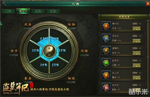 人物属性丹中有着各项丹药列表、丹药可通过九门论剑、功勋商店获取,人物的属性对于角色的输出和防御有着巨大的影响,玩家可通过增加命中、防御、韧性、暴击、闪避等技能属性百分比提高自己的倒斗综合能力。