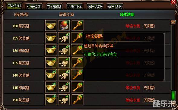 1、赤月传说冲级奖励。当玩家达到120、125、130、135、140、145、150级时,对应的奖励就有挖宝钥匙可领取。每一个都有5把挖宝钥匙,一共可领到35把。
