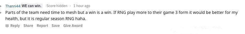 - 队伍需要一些时间去磨合,但胜利就是胜利,如果RNG能在第三场中有更多精彩的表现,我也不会担心了,但这是常规赛的RNG,哈哈
