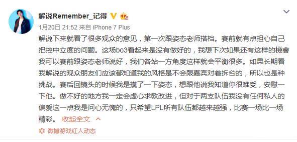 事后,解说记得发博澄清这件事情,他表示都是自己控场不好,没有把握好中立度。