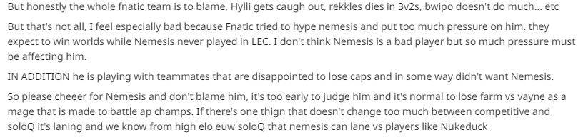 Caps的继任者,FNC新中单Nemesis,在赛前被寄予了很高的期望,但FNC在LEC第一周的两连败拿下0-2(也有人说是0-3)的积分后,人们开始对Nemesis的实力质疑,并将FNC失败的原因归咎于他的身上。对此,2015年全球总决赛四强选手、现S04总教练兼经理Amazing在推特上力挺这名小将,并呼吁大家理性看待。