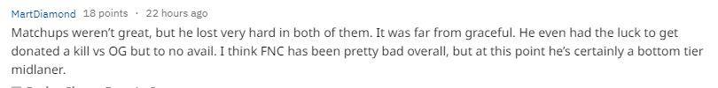 英雄确实劣势,但他两场都劣势得非常惨。这是洗不白的。在对上OG的时候,他甚至挺幸运的捡到了个人头,但没什么效果。我觉得FNC总体表现都很差劲,但目前,Nemesis肯定也是垫底中单。