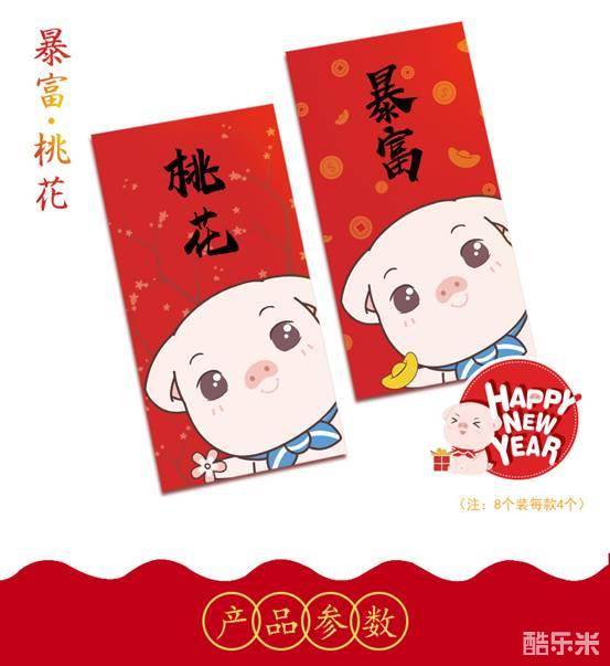 预售新年红包,猪豆包来啦,一包中包含8个红包,内含暴富包、桃花包各4个,售价仅为23.8元哦,还赠送小型聚宝盆×3,新的一年把好运都送给亲朋好友吧!