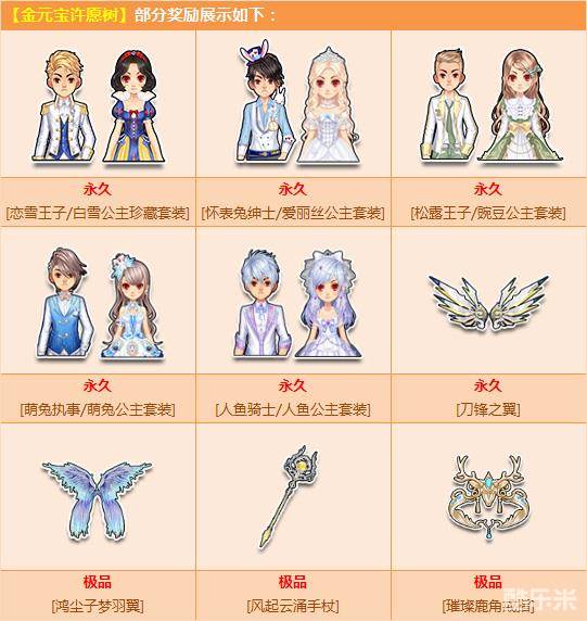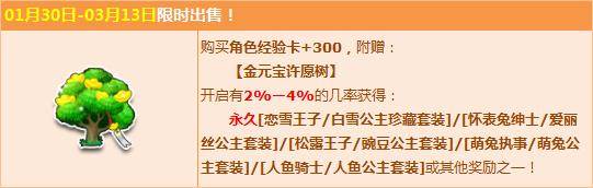 1月30日-3月13日期间,购买【角色经验卡+300】,赠送金元宝许愿树,有机会得永久【恋雪王子/白雪公主珍藏套装】/【怀表兔绅士/爱丽丝公主套装】/【松露王子/豌豆公主套装】/【萌兔执事/萌兔公主套装】/【人鱼骑士/人鱼公主套装】或其他奖励之一!其中核心奖励期限型概率为4%-6%,核心奖励永久型概率为2%-4%,非核心奖励概率为90%-94%。