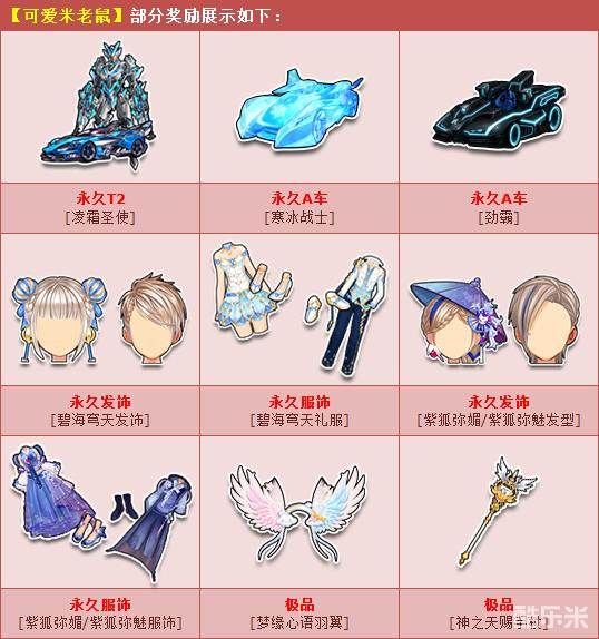 1月24日-3月3日购买角色经验卡+500,获赠:可爱米老鼠,开启有几率获得:永久T2【凌霜圣使】、永久A车【寒冰战士】/【劲霸】、永久【碧海穹天发饰/礼服】/【紫狐弥媚/紫狐弥魅发型】/【紫狐弥媚/紫狐弥魅服饰】或其他奖励之一!获得核心奖励永久型概率是:2%-4%,获得核心奖励期限型概率是:4%-6%,获得非核心奖励概率是:90%-94%。