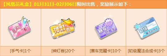 1月31日-2月6日期间,购【凤凰花礼盒】,赠送【手气卡】、【神灯券】、【赛车觉醒卡】、【初级魔法合成卡】等道具,每个QQ限购3次,只需6Q币机会难得,赶紧来参与!