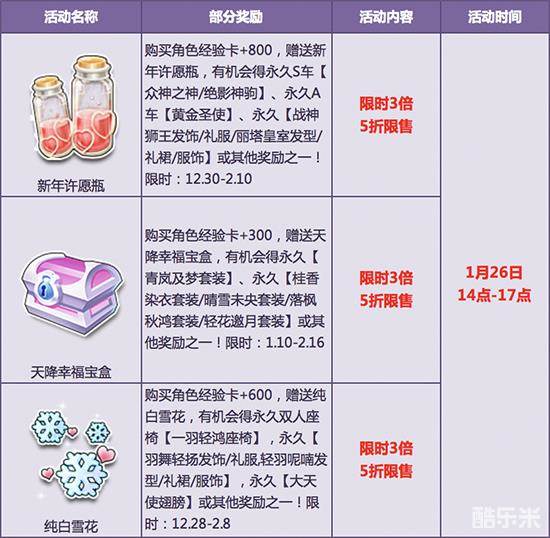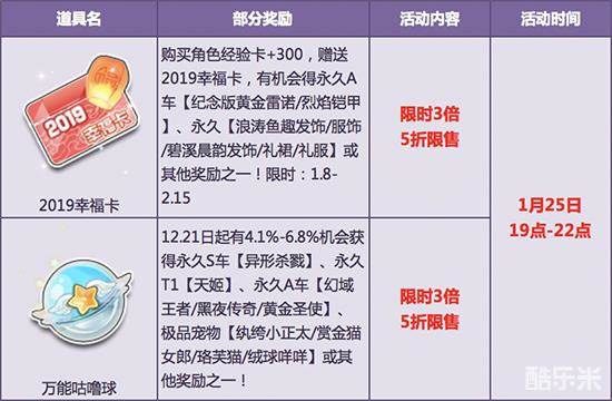 1月25日19点-22点、1月26日至27日每天14点-17点活动期间,每天2-3款人气道具限时5折出售,更有3倍极品爆率。其中,国庆人气宝箱【2019幸福卡】、【新年许愿瓶】、【纯白雪花】、【圣诞苹果】等均将限时降价,更高几率可获得永久S车【黑域电魔】/【众神之神】/【绝影神驹】/【异形杀戮】等奖励,还有变色六人骑宠【翰辰龙王】等你来哦!机会不容错过!