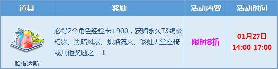 1月27日14:00-17:00期间,【哈根达斯】限时8折,必得2个角色经验卡+900,更有永久T3【终极幻影】、极品T2【黑暗风暴】、极品A车【炽焰流火】、极品【彩虹天堂座椅】等极品奖励!赶紧来参与!