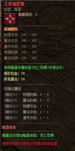 在以上的赤月传说暗器属性图中,我们可以看到使用暗器可以拥有一个新技能——死亡恐惧,玩家只要佩戴主宰流星镖或者霸者主宰流星镖都可拥有这个技能。这个技能为主动技能,若玩家佩戴的是主宰流星镖,使用后可降低对方2%暴击力和2%当前血量;若玩家佩戴的是霸者主宰流星镖,使用后可降低对方5%暴击力和3%当前血量。