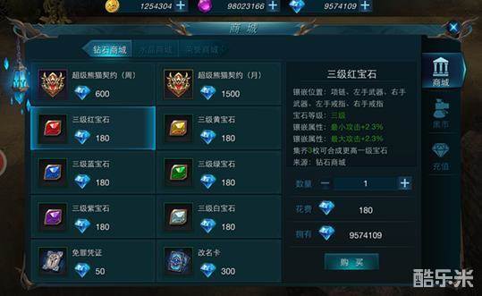 宝石的获取途径:3级以下的宝石,可以通过日常任务或者BOSS掉落获得,钻石商城可以直接购买3级的宝石,如果你跟小编不是土豪,那咱们还是踏踏实实做任务攒宝石吧,获得高等级宝石是迟早的事!