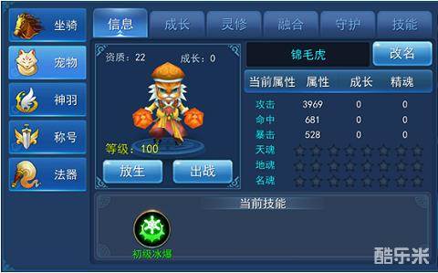 当我们获得第一枚宠物蛋时,宠物系统也便相应地解锁了。在宠物的信息界面我们可以看到宠物所有的信息,包括等级、资质、成长、炼魂和技能。宠物的等级与主角的等级相同,只要提升主角的等级,宠物的等级也会跟着上升哟!